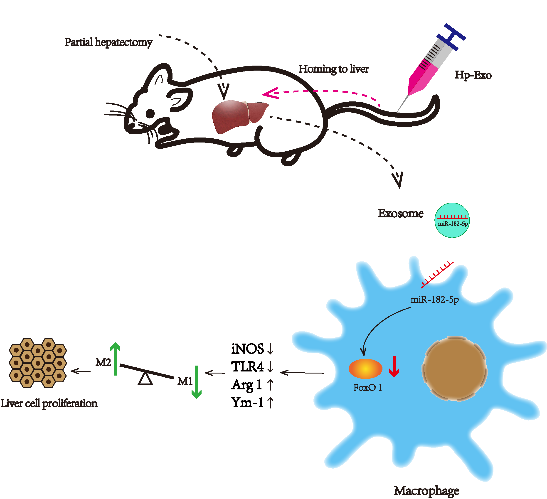间充质干细胞(MSCs)具有促进肝脏再生和功能的潜力,是治疗肝脏疾病的有吸引力的候选细胞。旁分泌模式可能参与了MSCs的治疗机制,外泌体(Exo)在MSCs旁分泌活动中发挥重要作用。低氧培养可显著提高MSCs移植的有效性,然而低氧预处理的MSCs(Hp-MSCs)是否能促进肝损伤再生,以及这种促进作用是否由Exo介导,尚不清楚。该研究深入探讨了低氧诱导间充质干细胞Hp-MSCs及其外泌体(Hp-Exo)对小鼠肝再生的作用及机制。该研究发现Hp-MSCs通过其分泌的外泌体促进小鼠部分肝切除后的肝再生,且外泌体主要被肝脏巨噬细胞吞噬。进一步研究显示,与常氧MSCs-Exo(N-Exo)相比,Hp-Exo在体内和体外均增强了M2巨噬细胞极化。MiRNA测序分析显示,与N-Exo相比,Hp-Exo中的miR-182-5p显著富集。机制方面,Hp -Exo中miR-182-5p通过靶向巨噬细胞中叉头盒转录因子1(FOXO1)和toll样受体4(TLR4)的表达,促进M2巨噬细胞极化,并进而发挥抗炎、促再生作用。这些结果表明Hp-Exo在肝损伤再生中的治疗潜力,并揭示了Hp-Exo促进肝再生的机制。